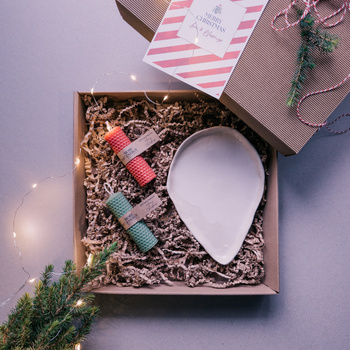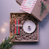 Świąteczny zestaw prezentowy | 2 świece słupkowe i ceramiczny świecznik | 100% wosk pszczeli