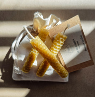 Wszystkie świece robimy ręcznie, wyłącznie z najwyższej jakości, europejskiego wosku pszczelego, naturalnie barwionego. Świece i ich opakowania są ekologiczne. Knot wykonany jest z bawełnianego sznurka, bez ołowiu i innych metali.